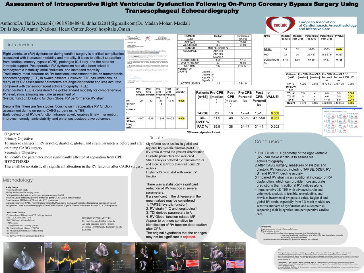148126 – Assessment Of Intraoperative Right Ventricular Dysfunction Following On-Pump Coronary Bypass Surgery Using Transesophageal Echocardiography. By Dr. Haifa Alzaabi [+968 9931 4553, dr.haifa2011@gmail.com ] Dr. Madan Mohan Maddali, Dr Is’haq Al Aamri